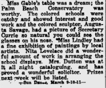 Savage continued to model clay, and in 1919 was granted a booth at the Palm Beach County Fair where she was awarded a $25 prize and ribbon for most original exhibit. Following this success, she sought commissions for work in Jacksonville, Florida, before departing for New York City in 1921.