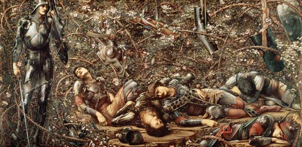 The painting depicts the discovery of the sleeping soldiers by a Knight. In their slumber they have become completed entwined by the barbed thorns of the Briar rose.