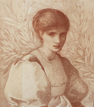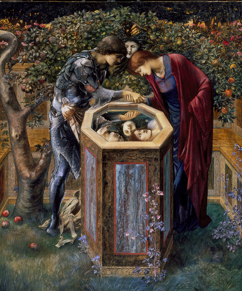 The title refers to Robert Browning's poem Love Among the Ruins, published in Men and Women in 1855. The work depicts two lovers in blue robes, a man and a woman, seated together on a stone capital amid the ruins of buildings. A broken column is at their feet, covered with briar rose, perhaps an allusion to Burne-Jones' Briar Rose series (two below). In the background is a door with a frieze of putti, and arches leading into the distance. The setting may be influenced by the ruins of Polyandrion from the book Hypnerotomachia Poliphili (The dream of Poliphilus).