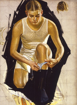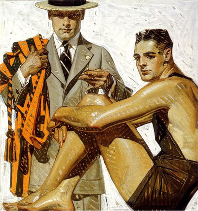 Many biographers have speculated on J. C. Leyendecker's sexuality (more recent research has found more conclusive evidence), often attributing the apparent homoerotic aesthetic of his work to a homosexual identity. Without question, Leyendecker excelled at depicting male homosocial spaces (locker rooms, clubhouses, tailoring shops) and extraordinarily handsome young men in curious poses or exchanging glances. Leyendecker never married, and he lived with another man, Charles Beach, for much of his adult life. Beach, the original model for the famous Arrow Collar Man, is assumed to have been his lover.