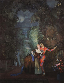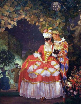 During the 1910s, Somov executed a number of rococo harlequin scenes and illustrations to the poems by Alexander Blok. Many of his works were exhibited abroad, and were particularly appreciated in Germany, where the first monograph on him was published in 1909.