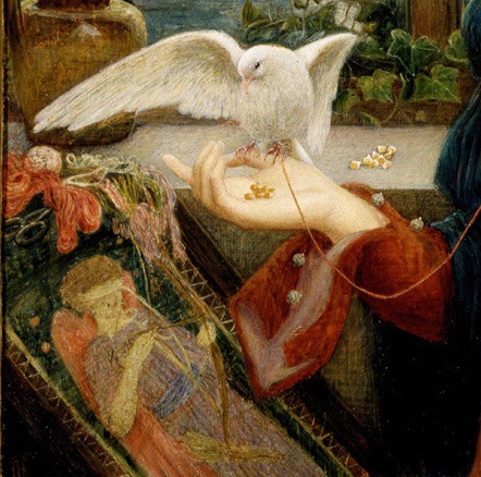 a dove that has carried a love letter to a woman standing in front of an open window. She wears a red rose, and has just put down her embroidery of a blind-folded Cupid. She holds the letter to her chest as the dove eats from the palm of her hand, a piece of string still connecting the dove to the letter. The blind-folded Cupid points a loaded arrow towards her. The artist modestly described the painting in 1906: