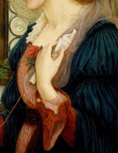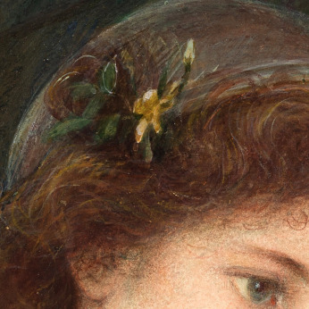 The painting depicts Dantes beloved Beatrice who appears in both the Vita Nuova and Purgatory. While Dante’s Beatrice is described in terms of the divine, Marie paints a more earthly beauty, lost in thought as she contemplates her reading. A bow of deep red roses climb the wall behind her, fallen petals resting near her book, by her arm sits a handful of pansies. A small sprig of yellow jasmine is tucked behind her ear. In the Victorian language of flowers, a burgundy rose means 'unconscious beauty', pansies mean 'thoughts' and yellow jasmine means 'grace and elegance'.