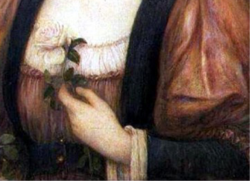 In her painting Marie depicts Armida standing in her rose garden at sunset, holding a pale pink rose to her chest. With the other hand she leans the stem of two roses towards her which results in their petals falling away, most likely a symbol of the heartbreak of Rinaldo's abandonment. In the language of flowers a pale pink rose means passion and desire, a withered rose mean 'I would rather die'.