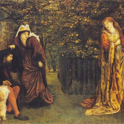 Also titled Messer Ansaldo showing Madonna Dionara his Enchanted Garden, the painting illustrates a tale from The Decameron, a collection of novellas by the 14th-century Italian author Giovanni Boccaccio. The book is structured as a frame story containing 100 tales told by a group of seven young women and three young men; that were sheltering in a secluded villa just outside Florence in order to escape the Black Death, which was afflicting the city. To pass the evenings, each member of the party tells a story each night, except for one day per week for chores, and the holy days during which they do no work at all, resulting in ten nights of storytelling over the course of two weeks. Thus, by the end of the fortnight they have told 100 stories.