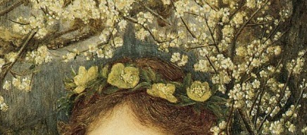 The painting depicts a woman standing in an olive green robe trimmed with gold, a flower is pinned to the front of her dress alongside a red heart shaped pin encrusted with diamonds. She wears a crown of green hellebores, in her right hand she holds a small crystal ball and in her left she holds a branch of blossom above her head, creating an curved arch of white flowers over herself. She stands in front of an oak tree with a placid expression on her face, a stream forks into the distance behind her.