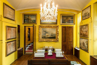 Entering through a door between bookcases and we were in the Breakfast room. The yellow room was lit with daylight pouring through mustard coloured windows. The centre of the room was domed and etched with a Greek pattern, and when one looked up, a lantern made of illustrated panels could be seen. On the walls were more bookcases, framed pictures of architectural designs, clocks, oil paintings and many round mirrors on the ceiling, which made one feel as if they were in a ship.