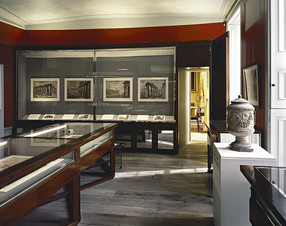 Next was the South Exhibition Gallery. Painted in a textured red, the wood paneling and ceiling has been painted in blue and white to look like clouds. It held the exhibition "The Romance of Ruins". This led through to the North Exhibition Gallery. The walls were a pale pink and grey, mahogany and glass cabinets lined the wall and artist models sat on a table at the centre. Now there were more rooms above, including the Model Room and Sir John Soane's private apartment, but these were closed on the day we visited.