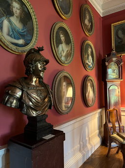Back through the Music Room and we were in what was called the Little Dining Room. Here the walls were once again painted red but this time in a much more softer hue. A small table with four chairs sat in the centre of the room and one end of the room were three large windows and I was surprised when I looked out of them to find a man juggling in the rain. I don’t know what must happen in a mans life to make him juggle in the rain on the lawn of a stately home but I prefer to believe that it was out of determination to learn than out of depression. The opposite end of the room had been separated by Corinthian columns where oval paintings framing a bronze bust of a man with an excellent moustache and a grandfather clock ticked softly away in the corner.