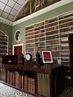Through a red ante room and we were in my favourite room in every house, the Library. The room was painted a cool green, bookcases lined the walls and even in the dim light, a series of stained glass windows were lit under the lattice ceiling. It was a grand room, added by a family member of the house in the 1790s. Sir Richard Colt Hoare was passionate about writing, traveling, art, archaeology, and the study of antiquities. His passions were reflected in the design of the room, with its Greek and Egyptian motifs as well as the many books that sat on the shelves. There are few more beautiful sights than rows upon rows of old gilded books.