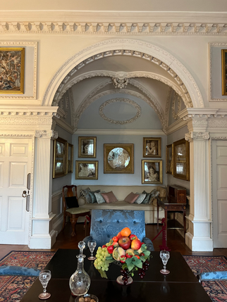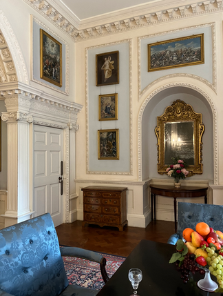 Through a door and we were in the Inner Hall. The walls were a soft green and two flights of white stairs rose out of the marble floor. More clocks softly ticked and while we were not permitted to go upstairs, glimpses of large mythological paintings could be seen on the first floor including a woman being given a mans head on platter. A garland covered in flowers had been draped along the balusters of the stairs in a hopeful but so far unfulfilled announcement of spring.