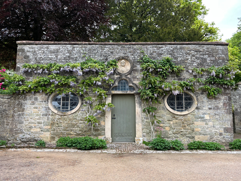 I arrived at Stourhead under a vale of rain with my usual companion in tow. We had unfortunately timed our visit to coincide with a marathon that was happening across the estate and so, as we walked through a small wood and up into the walled gardens, we had to wind our way through clusters of drenched runners and their supportive but damp families. Despite the rain we couldn't help but stop and admire the wisteria and the tumbling yellow roses. The finish line was in front of the house and as we rushed passed under the shelter of our umbrellas, making a beeline for the shelter of the house, the clock told us that they had been running for eight hours. With this sea of soaked people at its doorstep, a country house has never looked so inviting.