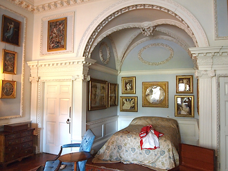 This was followed by the Italian Room, painted in a mix of white and powder blue, a small alcove was the feature of the room, whose original purpose was once to enclose a bed. Three damask chairs sat at a mahogany table carved with the image of Dionysus and banners of grapes, three glasses and an empty decanter waited for a party that would never come.