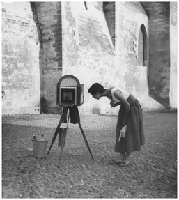 "For three years between 1953 and 1956, she traveled to Paris, Florence, and Rome to photograph the latest collections for German magazines. Her models were the stars of the era; instead of positioning them in luxurious settings, she placed them around the city, surrounded by passersby. “I had no need to refer to locations,” she later explained about her photographs of evening gowns that were not taken in the opera or in a ballroom. “I saw it in terms of lines, forms, design, in terms of the dress.” She also wanted to get away from the sweet kitsch of smiling models. Her photographs are carefully composed and depict self-confident women whose clothing becomes a form that corresponds to the architecture of the city."
